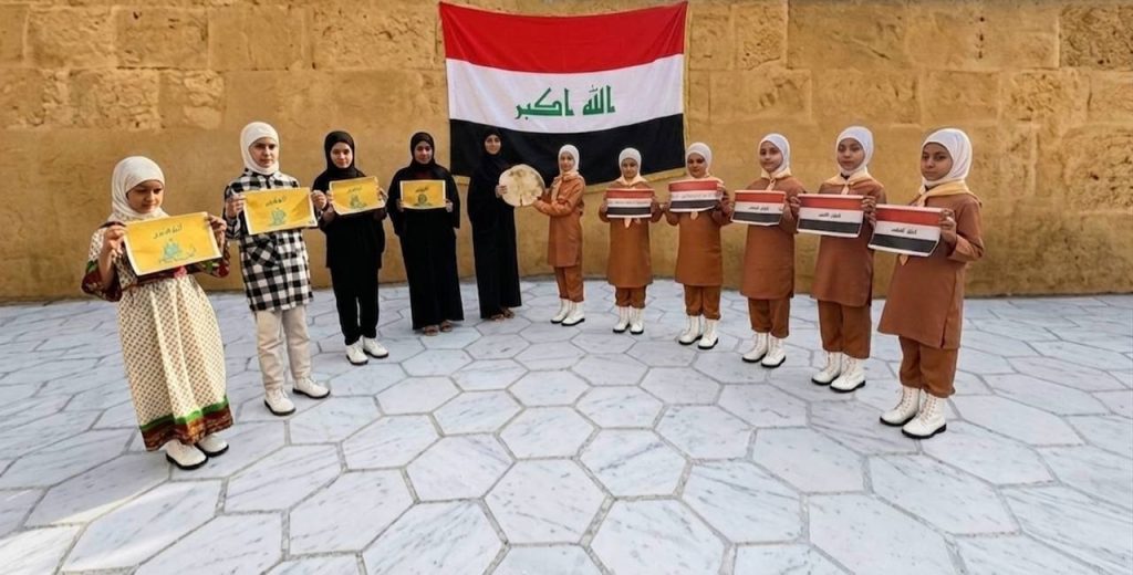 كشافة سيد الشهداء مفوضية بغداد للمرشدات فوج بانتظار القائم (عج) وتم رفع اعلام العراق وإيران والمقاومة الإسلامية حزب الله