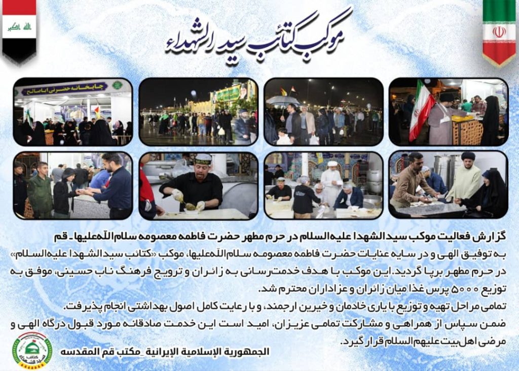 حسب توجيهات الامين العام لكتائب سيد الشهداء الحاج ابولاء الولائي.. اقام المكتب الثقافي في الجمهورية الاسلامية الايرانية مكتب قم المقدسه موكبا خدميا لمدة يومين داخل حرم السيدة فاطمة المعصومة/ صحن جواد الائمة